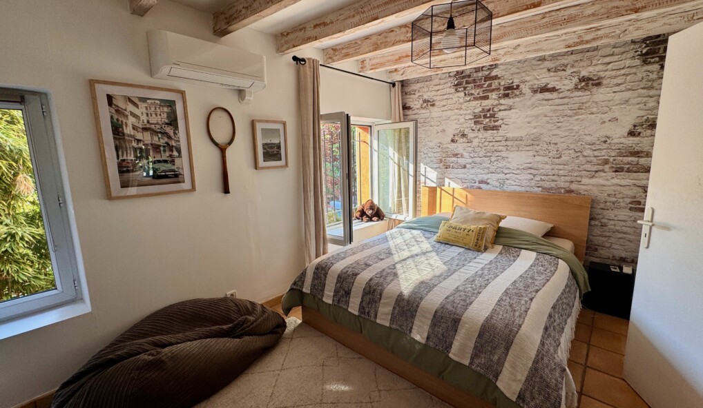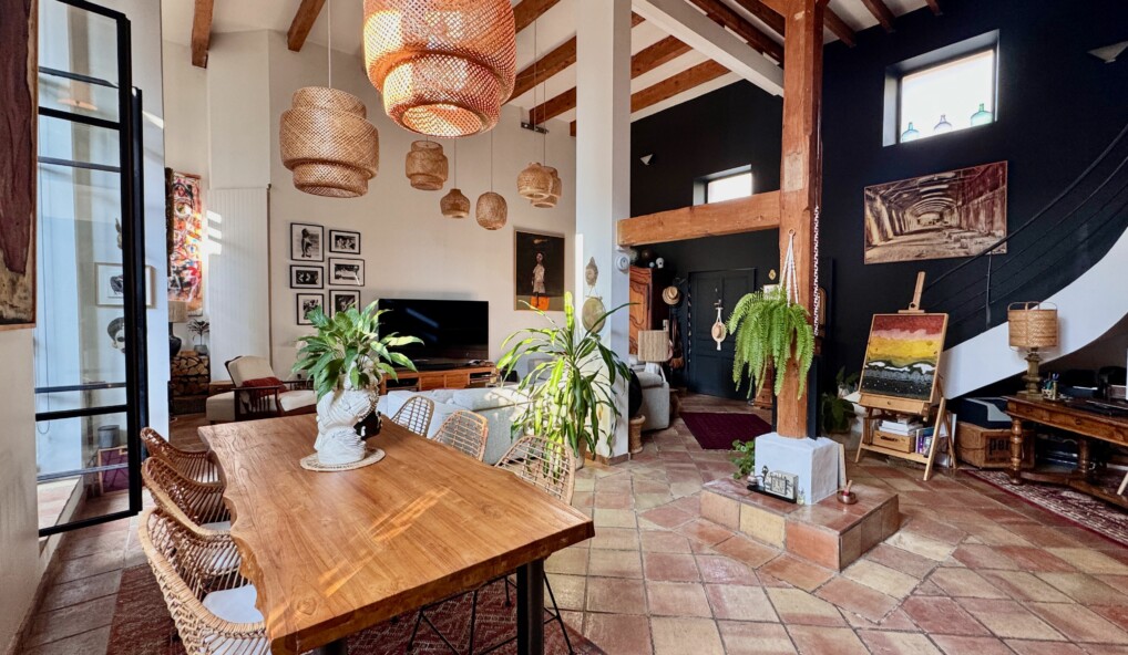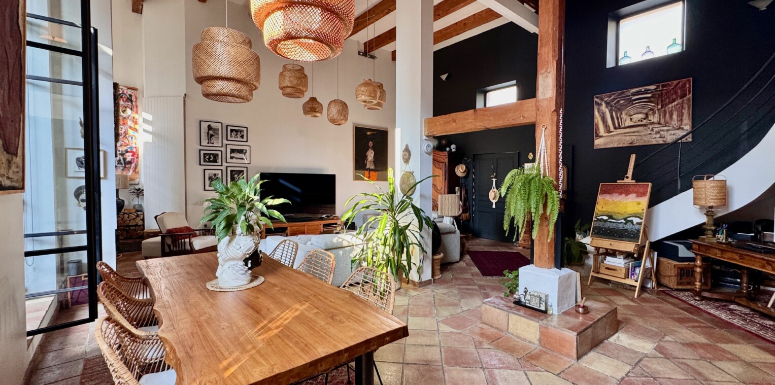 Ce duplex qui se vit comme une maison de ville au cachet exceptionnel est issue d’une réhabilitation réussie d’une ancienne menuiserie. Au sein d’une mini copropriété de 4 lots, ce duplex aux allures d’atelier d’une surface de 175 m2 bénéficie d’un jardin de 150 m2 de plain pied avec piscine et cuisine d’été. Avec une hauteur sous plafond de 6 mètres, l’espace de vie de 85 m2 orienté au sud est lumineux et s’ouvre sur le jardin par 3 grandes et hautes portes-fenêtres. Le sol en parefeuille en terre cuite, les poutres apparentes, la cheminée à insert et la charpente en bois massif soulignent le caractère chaleureux de cet espace de vie. Ce vaste et volumineux niveau est composé par une entrée, un salon, une salle à manger, un espace bureau, une cuisine US équipée prolongé par un cellier/buanderie de 7 m2, un WC invités indépendant, une suite parentale de 25 m2 avec salle de bains et dressing. On accède à l’étage par un bel escalier en pierre. Ce niveau est composé de 2 chambres de 13 m2, 2 salles de bains et 2 dressings, un bureau en mezzanine et un WC indépendant. Le bien dispose d’un parking et d’une dépendance de 18 m2 dans le jardin. Ce lieu de vie hybride est en parfait état, au calme et sans vis-à-vis. Tous les commerces et commodités (tramway, gare …) sont à 2 pas. Rare à la vente!