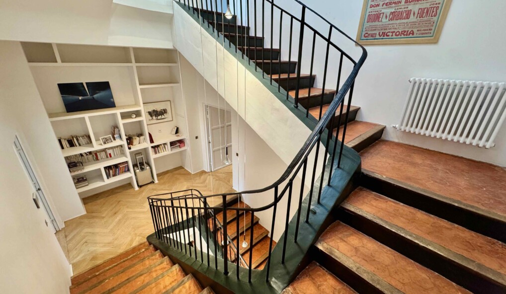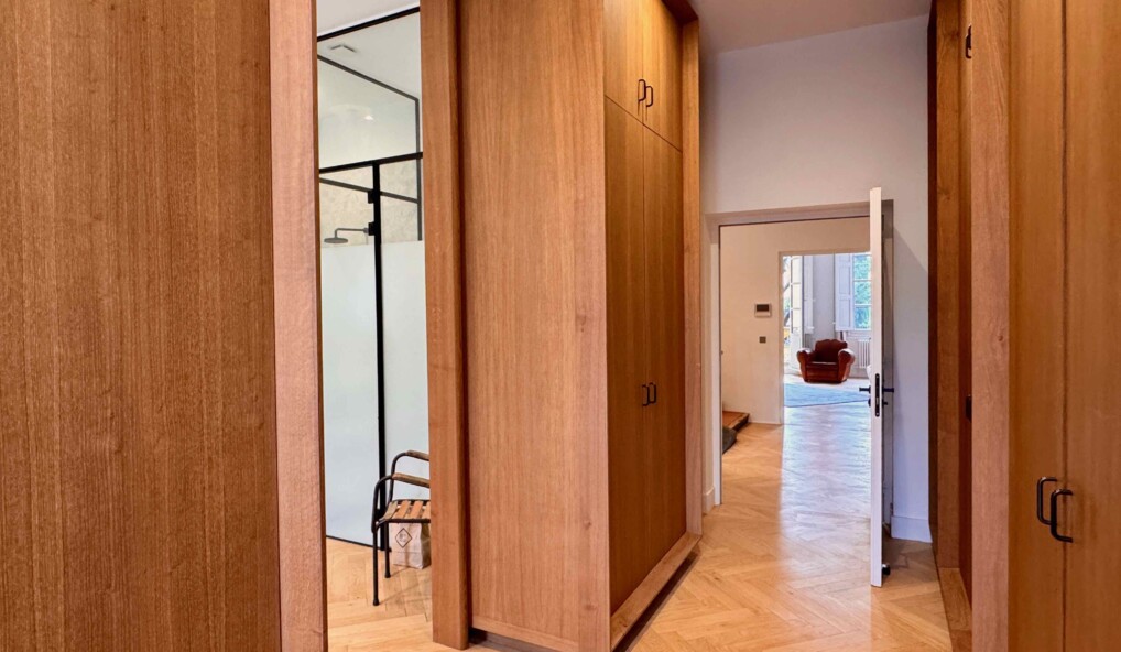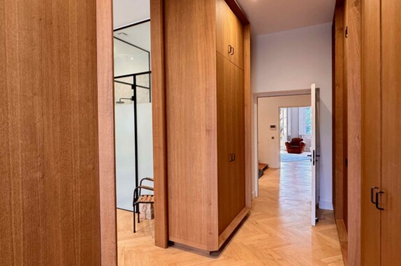 L’entrée annonce le caractère du lieu : volumes généreux, matériaux nobles, circulation fluide. La maison dispose d’une cage d’escalier remarquable ainsi que d’un ascenseur existant — aujourd’hui hors service — qui pourra être réhabilité par les futurs occupants s’ils souhaitent en retrouver l’usage. L’exposition sud assure une belle clarté à chaque niveau, soulignée par un parquet en chêne travaillé dans l’esprit des demeures anciennes.