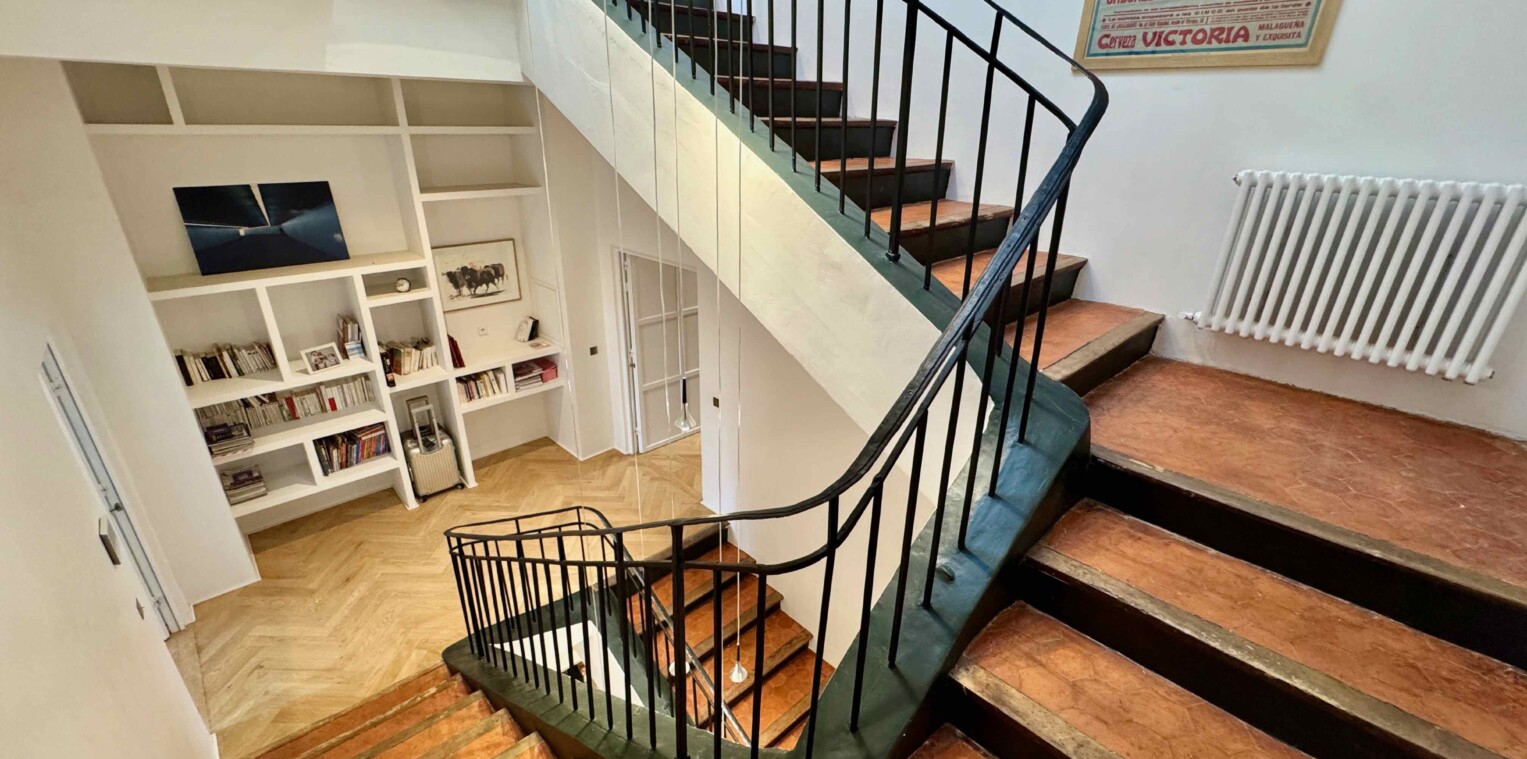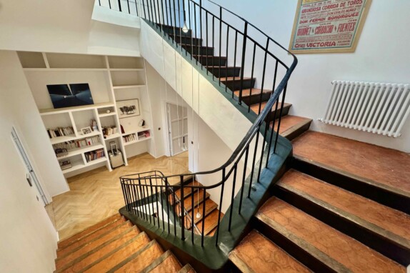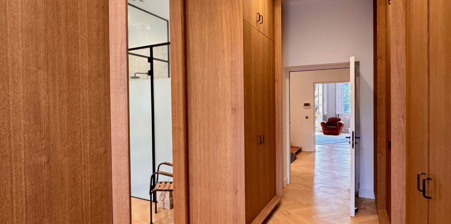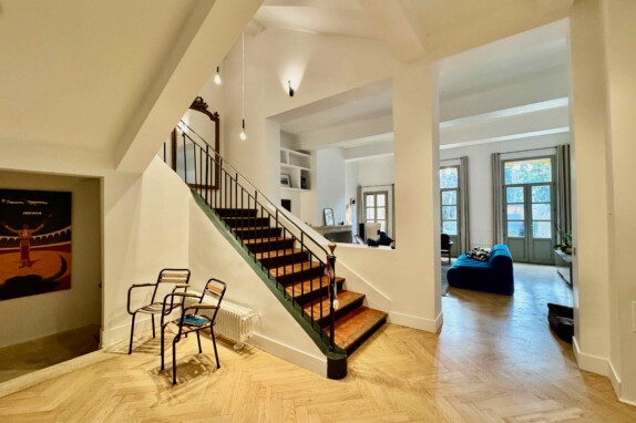 L’entrée annonce le caractère du lieu : volumes généreux, matériaux nobles, circulation fluide. La maison dispose d’une cage d’escalier remarquable ainsi que d’un ascenseur existant — aujourd’hui hors service — qui pourra être réhabilité par les futurs occupants s’ils souhaitent en retrouver l’usage. L’exposition sud assure une belle clarté à chaque niveau, soulignée par un parquet en chêne travaillé dans l’esprit des demeures anciennes.